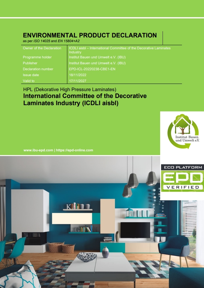 Die in EPDs enthaltenen umfassenden Ökobilanzdaten und Informationen sind in einem einheitlichen Format auf wenigen Seiten kompakt zusammengefasst. Bei der EPD des ICDLI handelt es sich um eine europäische Durchschnittsdeklaration, bei der Daten von HPL-Herstellern aus ganz Europa gesammelt und ausgewertet wurden. Seit 2012 liegen durchgängig repräsentative Informationen zum Umwelt Durchschnittsprofil für HPL und HPL-Compact vor.